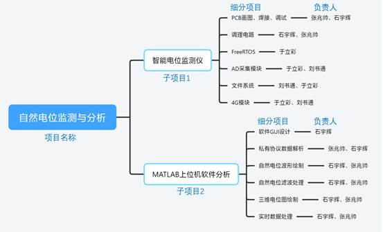 初定项目,团队的每个成员都按照自己的想法与老师进行了交流,很快就根据自己所擅长与感兴趣的部分定下了各自的分工。比如于立彩同学就对FreeRTOS的移植与使用十分感兴趣,主动承担了智能电位监测仪的软件调试部分。石宇辉与张兆帅同学则是想利用之前在《MATLAB应用实践》中学到的软件设计的相关知识融入在项目上位机软件的开发中。