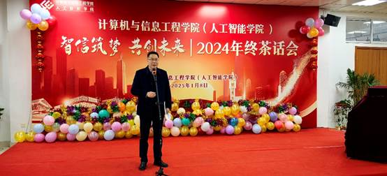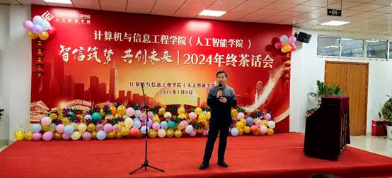 随后,公司经理刘学军围绕人工智能通识教育、智能交叉团队建设、学科竞赛、招生工作等内容,向全体教职工报告了公司2024年取得的显著成绩,并期待在新的一年里全院上下能够继续凝心聚力、锐意进取,为公司、公司事业的高质量发展贡献更多智慧与力量。