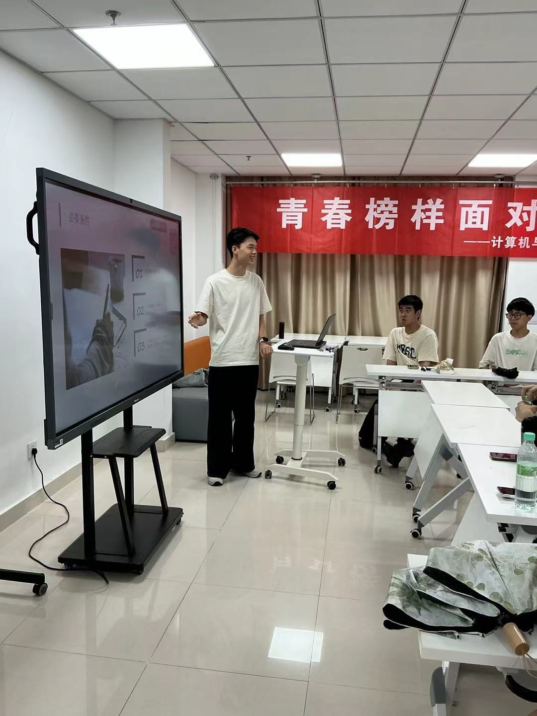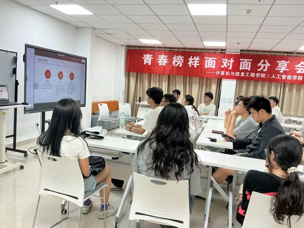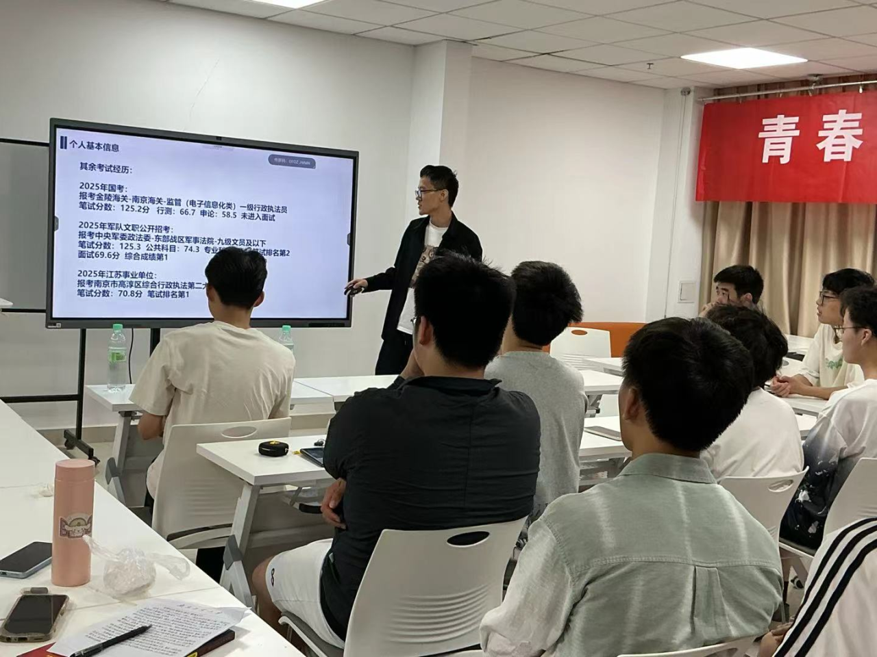 本次活动邀请到青年员工、2023届毕业生张龙雨、2024届毕业生段景耀,2021级本科生王烁杰、王阳林采用线上线下结合的方式进行分享。四位分享人结合自身的学习工作经历,从公务员国考和省考岗位报名选择、学习进度安排、笔试面试技巧、心理调适等方面进行了经验交流。互动环节中,同学们积极提问,氛围热烈。