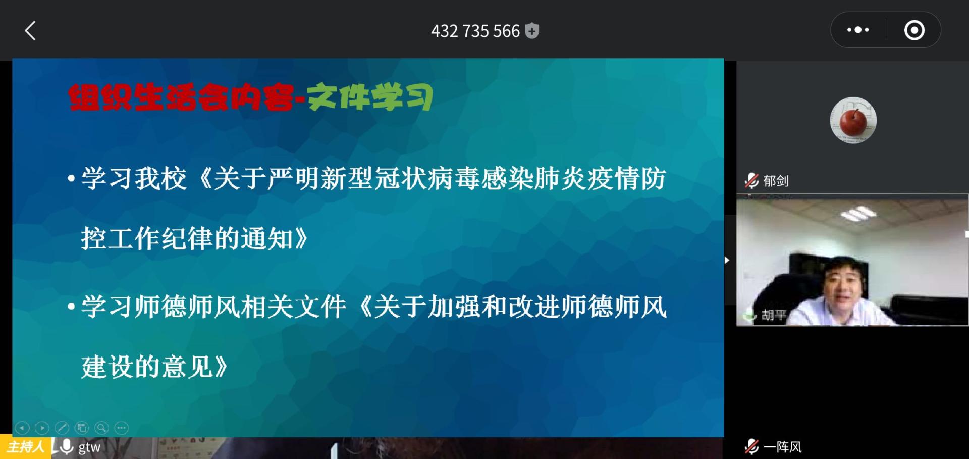 5月15日上午10点,bevictor伟德教师第五党支部召开了主题为“同心抗疫 党员先行 教学不断”的线上组织生活会。会议在腾讯会议平台上进行,由支部书记郭天文老师主持,支部全体党员参加了线上会议。