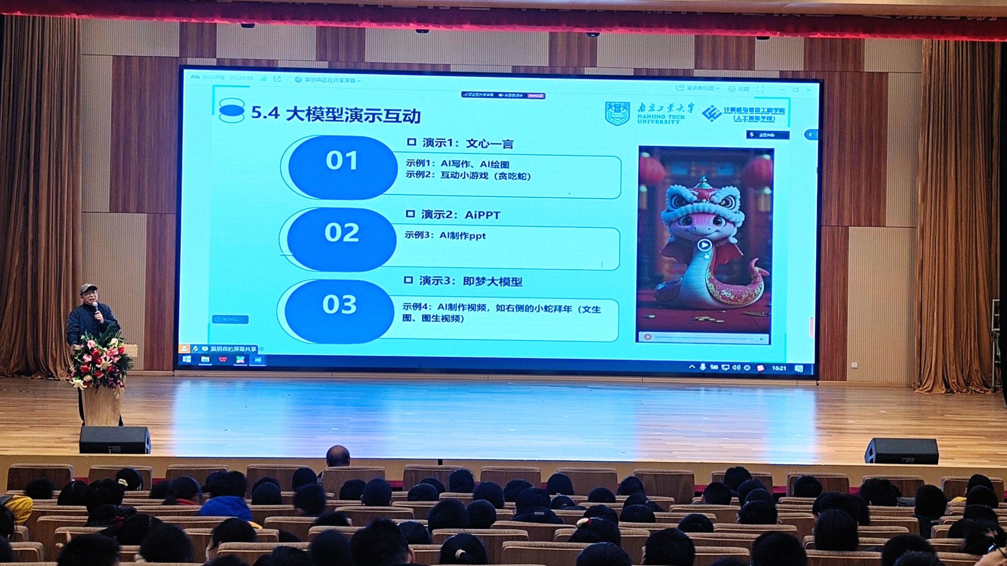 在最后的大模型现场操作演示与互动环节,他展示了多个国内外先进的大模型应用,如文心一言、即梦大模型、AiPPT等,并通过实际操作演示了AI写作、绘图、视频、制作PPT等神奇功能。师生们积极参与互动,现场氛围热烈,大家纷纷表示受益匪浅。
